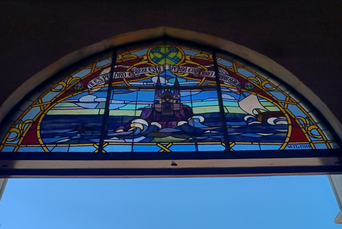 Os vitrais historiados estão dispostos em sequência, com o guarda-corpo e a escadaria do coro feitos de madeira, mantendo suas características cromáticas originais. O púlpito, retábulos de madeira, o sacrário e o baldaquino em latão polido, assim como os castiçais e mesas litúrgicas, são peças que mantêm um estilo formal e cromático definido. A imagem de São Pedro com o pé desgastado, ladeada pelas imagens de São Pedro e São Paulo, o trono e o baldaquino de madeira, e a via sacra em suas estações originais também são destaques.